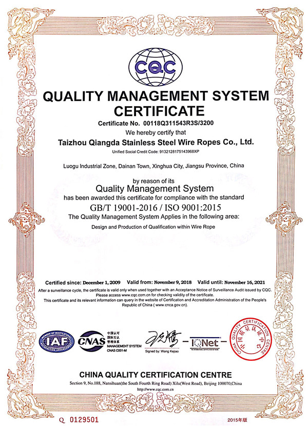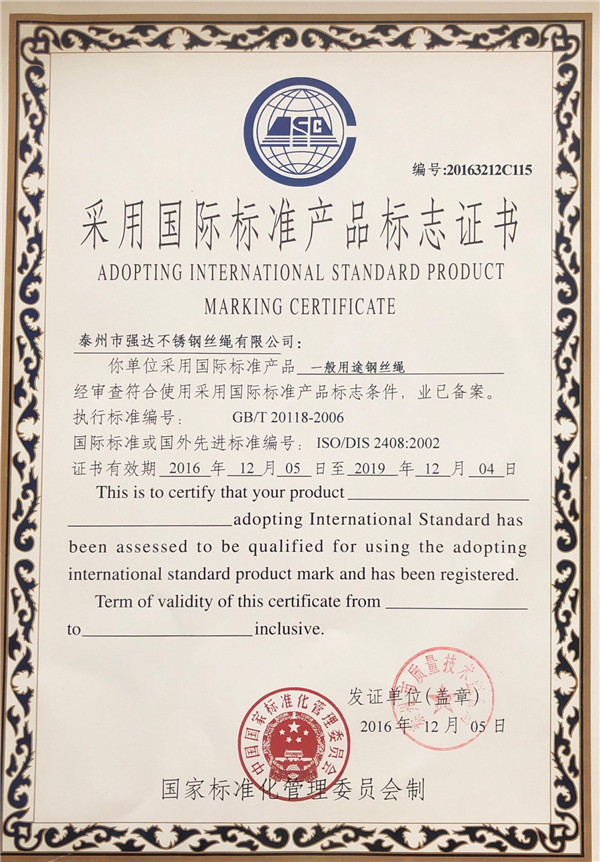 泰州市強達不銹鋼絲繩有限公司位于江蘇興化市戴南經濟開發(fā)區(qū),公司致力于不銹鋼絲繩產品生產,立志成為“國內技術標桿型吊索具生產企業(yè)”。以此戰(zhàn)略思想指導,公司堅決貫徹“質量贏市場,管理增效益,誠信贏天下”的質量方針。以完善的服務在國內不銹鋼絲繩市場樹立良好的品牌形象。公司榮獲“江蘇省質量信得過企業(yè)。 靈活的管理機制,經驗豐富的